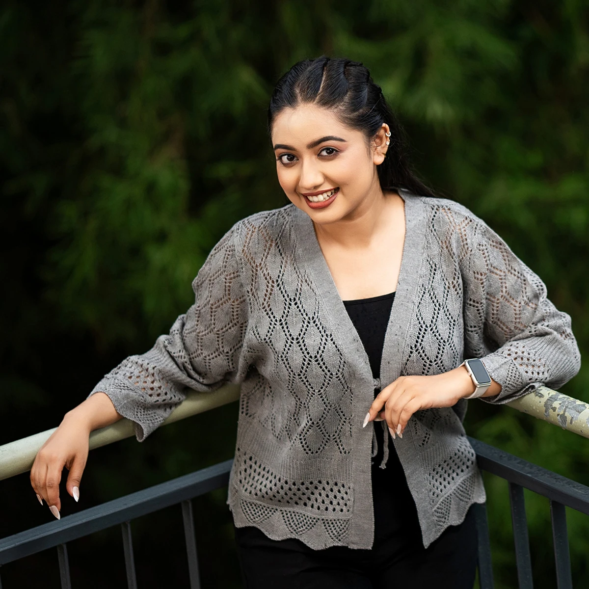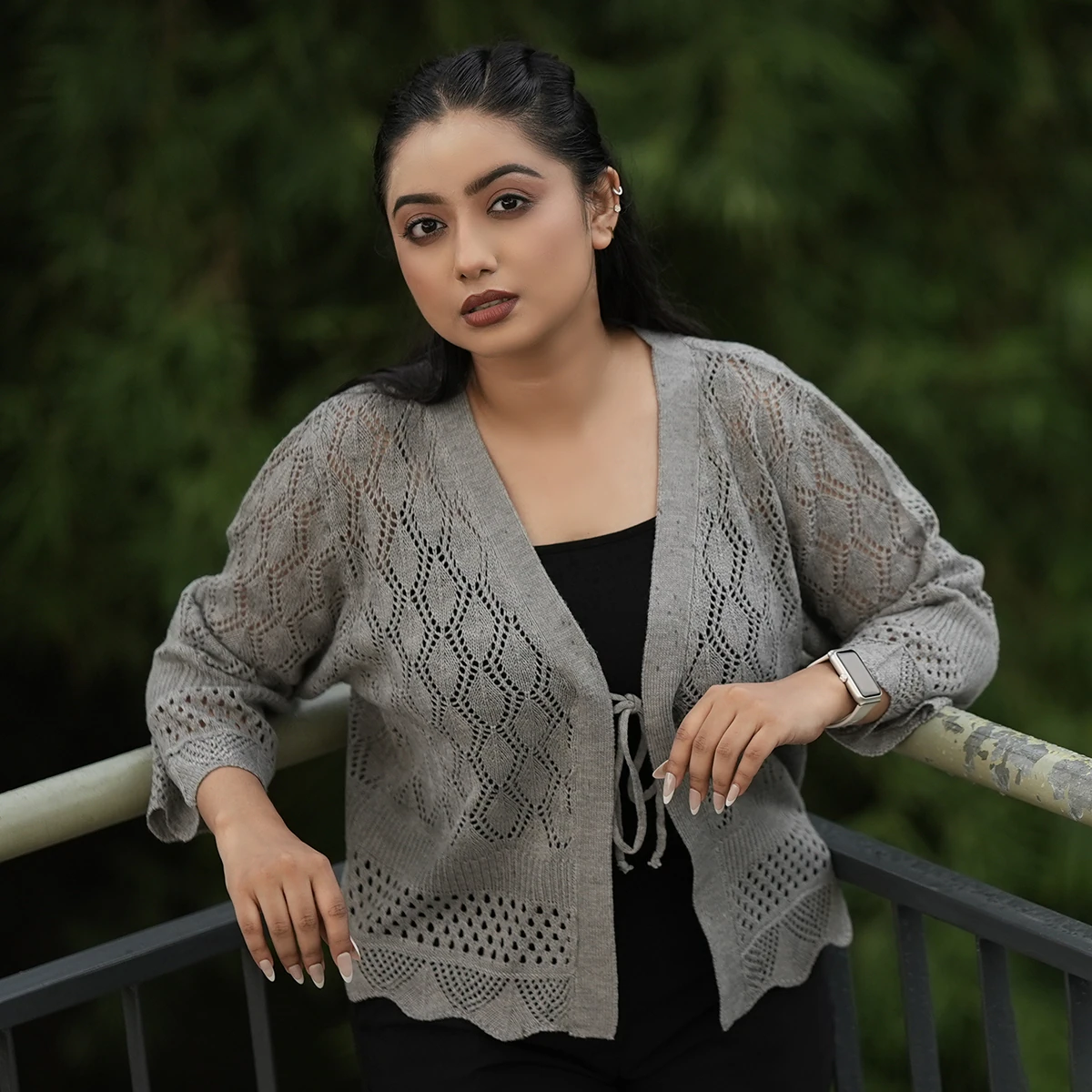Stay warm and stylish with this classic grey knit top, made from soft and cozy acrylic wool. It features a delicate open-knit pattern, V-neckline with front tie, and three-quarter sleeves for a comfortable and elegant look. Perfect for layering over camisoles or pairing with jeans, this top adds a touch of sophistication to your winter wardrobe.