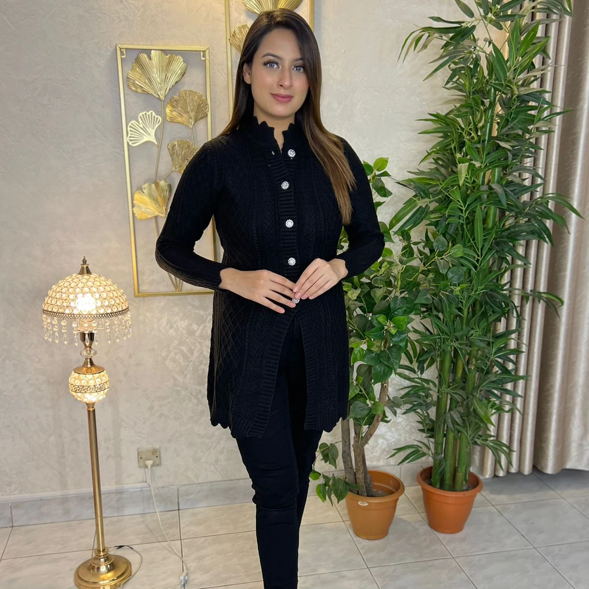 Experience timeless sophistication with the Elegant Black Knit Cardigan — a perfect wardrobe essential for the modern woman. Crafted with premium acrylic wool, this beautifully textured cardigan combines comfort, warmth, and a polished look suitable for any occasion.
