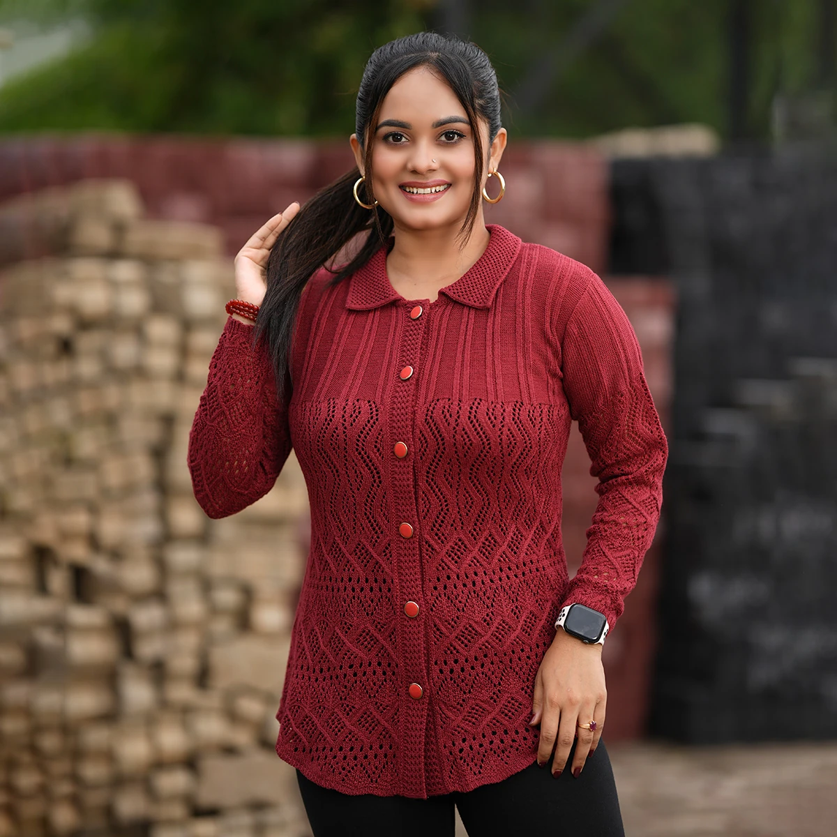 Stay cozy and fashionable this winter with our Elegant Maroon Knit Cardigan, crafted for warmth and sophistication. Made from premium acrylic wool, it features a stylish open-knit pattern, shirt collar, and front button closure with matching maroon buttons. The soft, breathable fabric ensures comfort, while the elegant maroon shade adds a touch of class to your winter outfit. Perfect for both everyday wear and office settings.