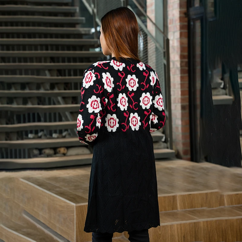 Bring elegance and warmth to your winter style with the Floral Grace Winter Cardigan — a stunning piece that blends floral charm with cozy sophistication. The black base with bold red and white flower patterns adds a touch of timeless beauty to your outfit, perfect for any occasion.