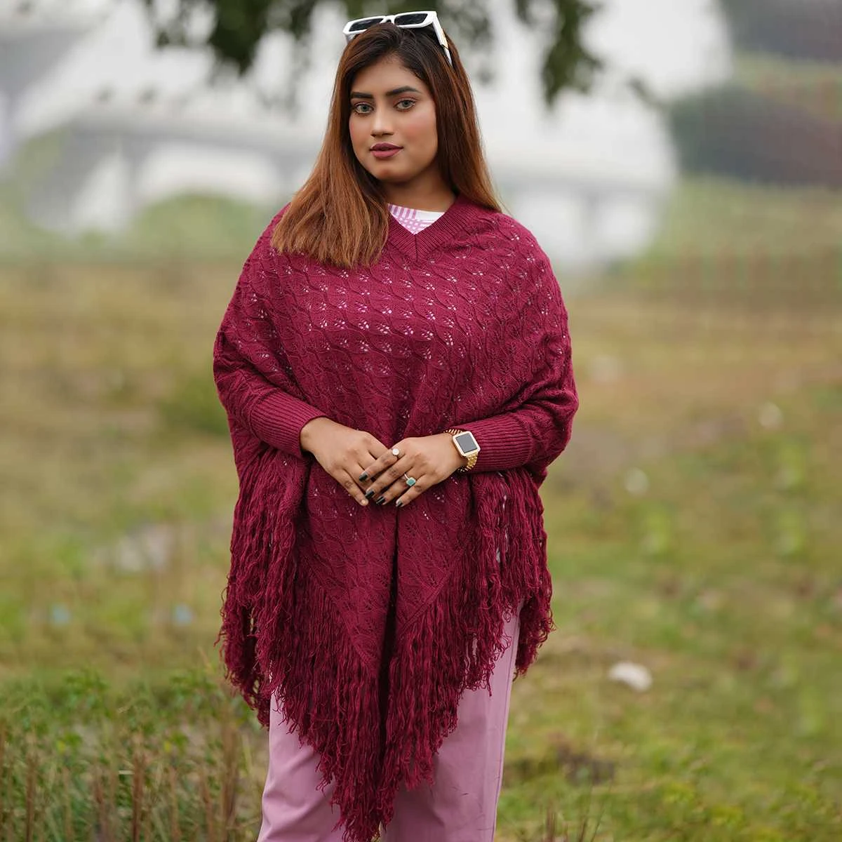 Wrap yourself in cozy elegance with this maroon knitted poncho, designed for effortless style and warmth. Featuring a beautiful open-knit diamond pattern, soft ribbed sleeves, and stylish fringed edges, this poncho is the perfect statement layer for chilly days. Its flowy design flatters all body types while keeping you snug and fashionable — ideal for pairing with jeans, trousers, or dresses.