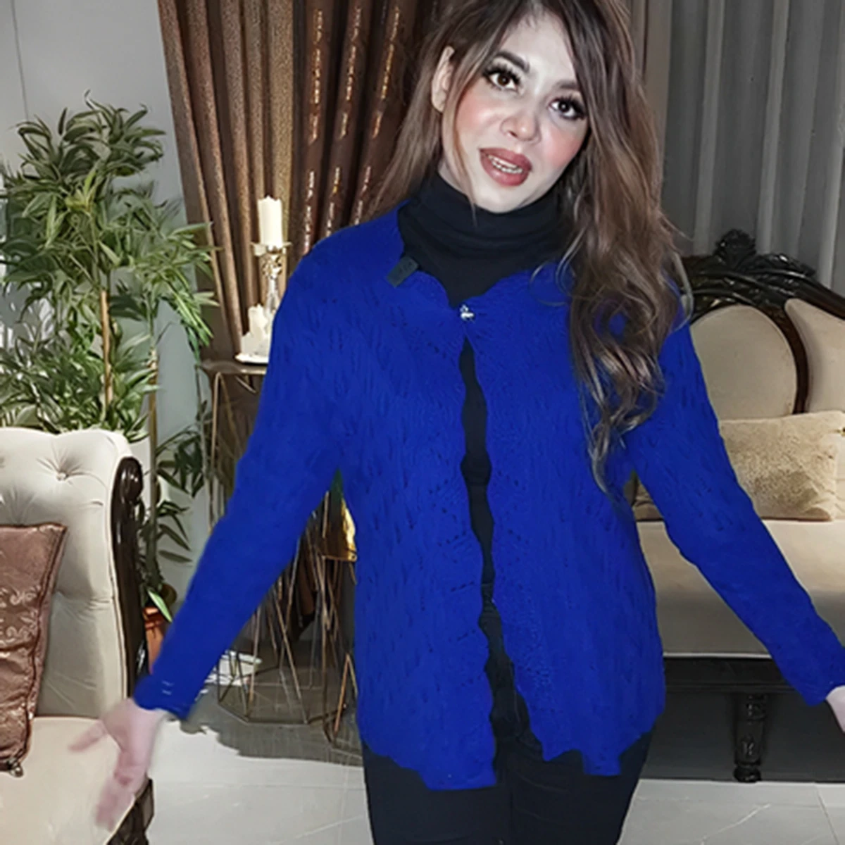Add a touch of elegance to your winter wardrobe with this royal blue short crochet knit cardigan, crafted from soft and premium acrylic wool for lasting warmth and comfort. Its intricate open-knit design offers a delicate, feminine look while keeping it breathable and cozy. The scalloped edges and V-neckline enhance the chic style, making it a standout layering piece for any outfit.