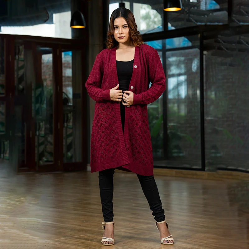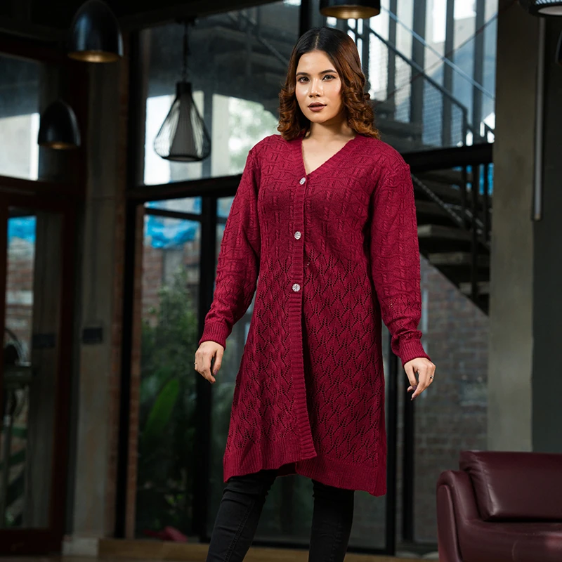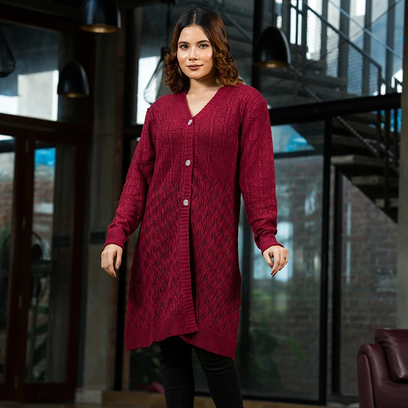 Embrace timeless elegance with the Wine Red Classic Knit Cardigan — a perfect winter essential that blends warmth with sophistication. Crafted from soft acrylic wool, this beautifully textured cardigan offers a cozy feel while adding a rich touch of style to your look.