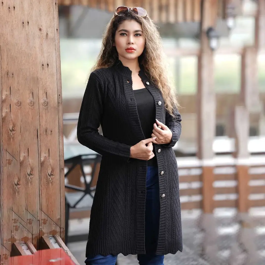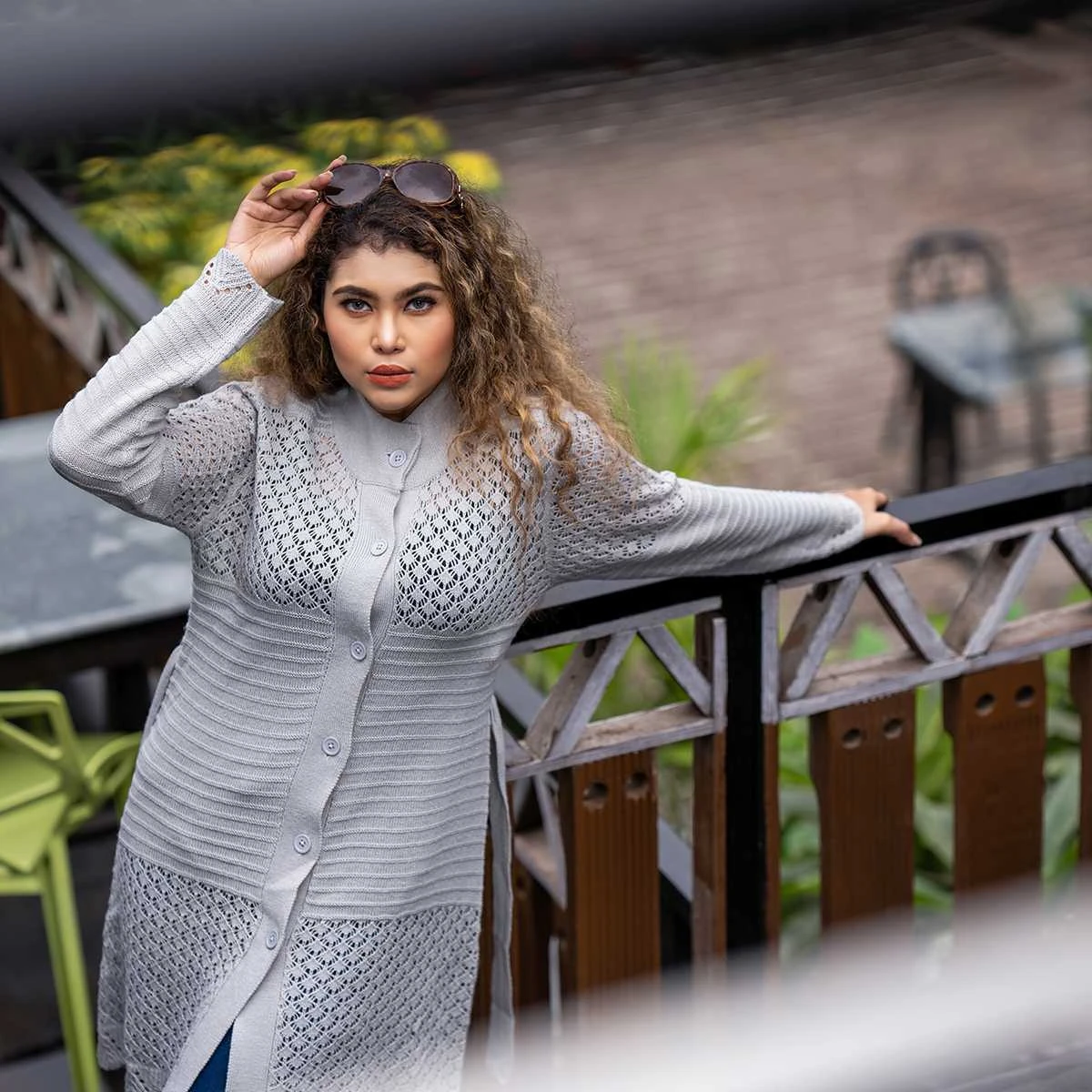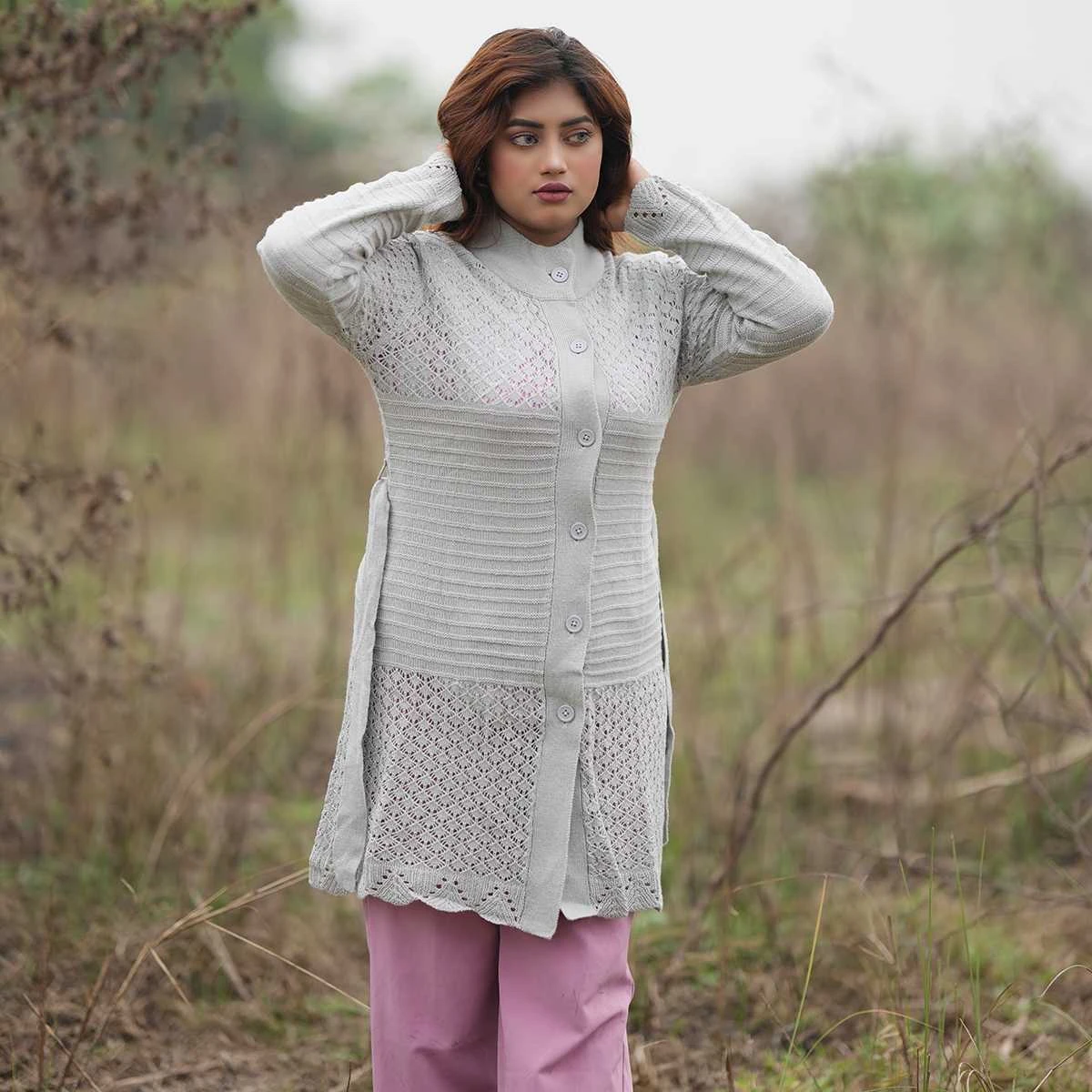 Bring a touch of sophistication to your winter wardrobe with this elegant long grey knit cardigan. Designed with a front button-down style, high-neck pattern, and intricate open-knit detailing, this piece combines warmth, comfort, and timeless elegance. Its figure-flattering ribbed midsection enhances your shape while offering cozy flexibility — making it perfect for casual days, office looks, or chilly evenings out.
